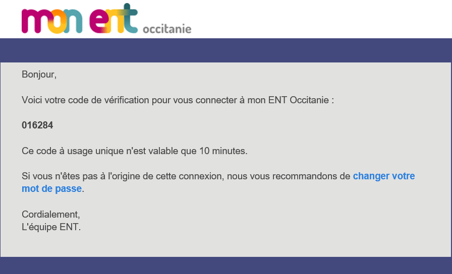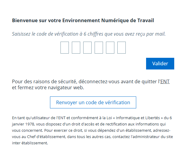 Une fois la double authentification activée, un code supplémentaire vous est demandé à chaque nouvelle connexion à l'ENT, juste après avoir entré votre identifiant et mot de passe.