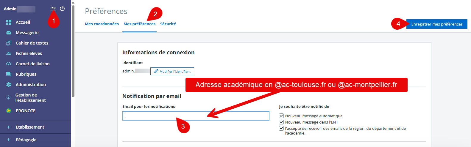 ✅Configuration de l’adresse e-mail professionnel dans la zone Notifications par e-mail (mes préférences) :