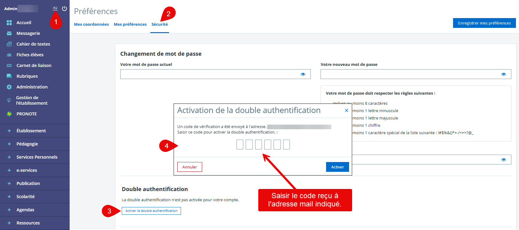 Pour activer la double authentification sur ce compte ENT, vous devez d’abord renseigner une adresse email professionnelle dans "Mes préférences". La présence de cette adresse email est indispensable.