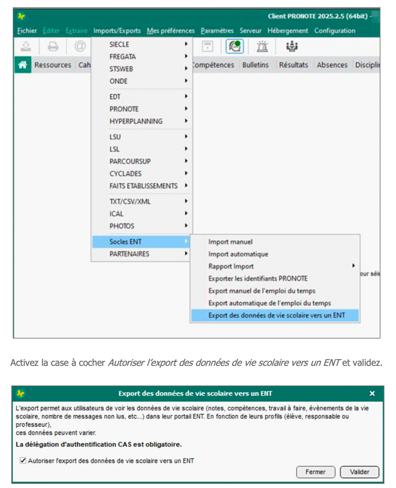 1. Côté Pronote sur la console d'hébergement Pronote (accessible depuis EDT ou Pronote par le chef d'établissement) :